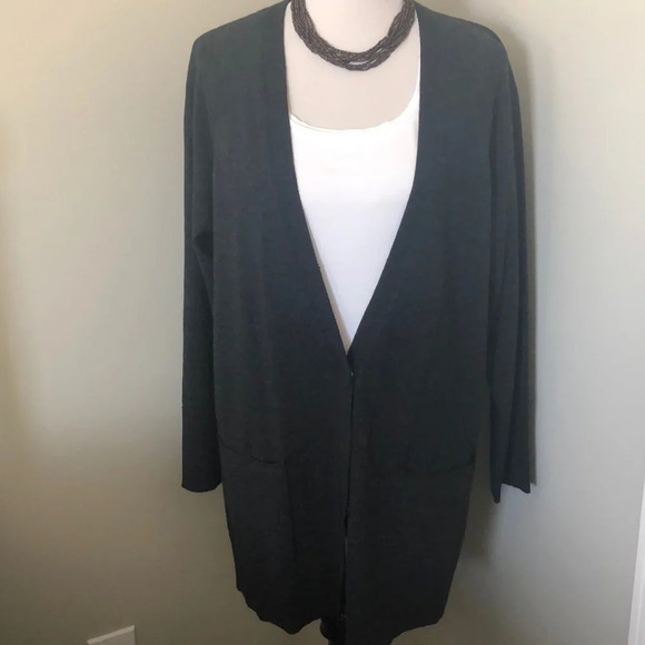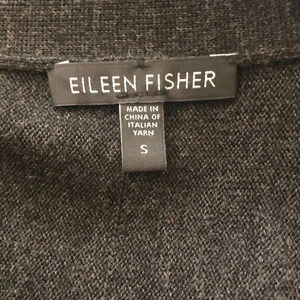 Great Eileen Fisher CHARCOAL (imo) merino wool cardigan. Very good used condition. Worn only a few times. Pockets are still stitched shut. Slight flaw on left opening (see pictures). Barely noticeable.