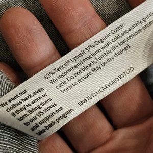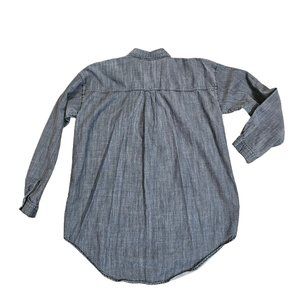 This Eileen Fisher blouse is a versatile addition to your wardrobe. With a collared neckline, button closure and long sleeves, it's perfect for travel, business or casual wear. The gray chambray fabric is made from Tencel and organic cotton for a comfortable, machine washable fit. The blouse is a size M with a classic, regular fit and casual sleeves. It has a contemporary, minimalist style that is simple yet modern, making it a great choice for any occasion. The blouse is perfect for those who love the basics and want a stylish, yet simple wardrobe addition.