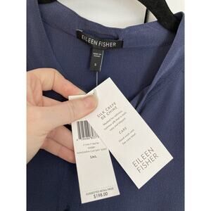The Eileen Fisher Mandarin Collar Boxy Silk Crepe de Chine Tunic Top in Small Blue is a stylish and versatile piece suitable for various occasions such as travel, casual wear, workwear, and business settings. Made from lightweight and easy-care silk crepe fabric, this tunic top features a relaxed fit with a band collar and long sleeves, making it comfortable for all-day wear. With a solid blue color, this top adds a touch of elegance and sophistication to any outfit, whether for a day at the office or a casual outing. The addition of pockets adds both functionality and style to this timeless and classic piece from a reputable designer brand. Exact color is blueberry. Easy washable silk!