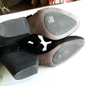 Suede heels with crisscross straps at center and zipper. Excellent condition.