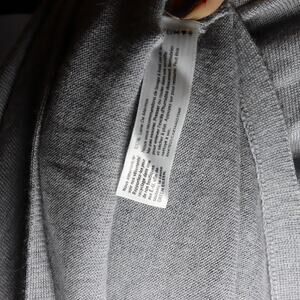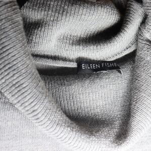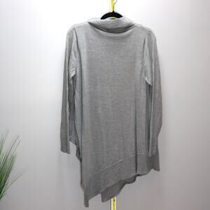 Eileen Fisher 100% merino wool turtleneck sweater in soft heather gray. Features an oversized, flowy silhouette with a dramatic asymmetrical hem and relaxed draped collar. Lightweight, warm, and breathable. Good condition with no holes or major wear noted.