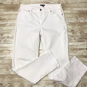 White skinny jeans, zip fly with button closure, mid rise, stretch