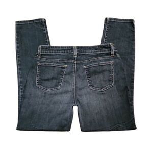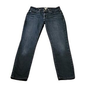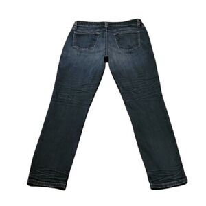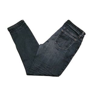 Stonewashed stretchy mid-rise jeans. Single button and zipper front closure. Textured whiskering accents. Sanded detail. Five pockets.