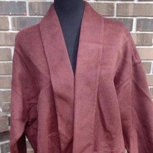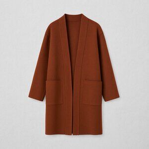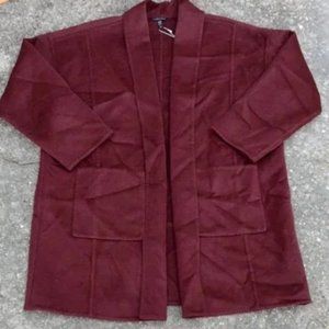 • Design: high collar, dropped shoulders, functional front pockets, long sleeves, open front, unlined for effortless layering