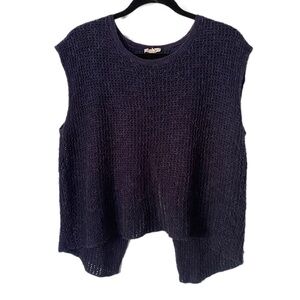 Eileen Fisher Navy Crochet Knit Split Back Top Organic Linen Cotton Blend Size XL