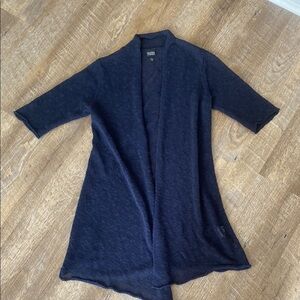 Elegant gray sweater cardigan by Eileen Fisher. Perfect for layering. Organic linen blend. Deep navy blue. Excellent preowned condition. No rips, stains, or odors. See all photos. The measurements are in the photos. I love offers.