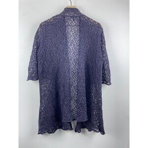 Description: Gray color with rich blue undertones and silver metallic threads throughout. Crochet / Open knit lacy detail. See-through. Open front, no closure. 16" sleeves. Slightly drapey collar. Linen blend.