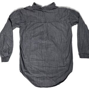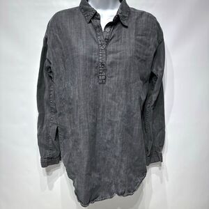 This Eileen Fisher top is a stylish and versatile addition to any wardrobe. Made from a comfortable and durable cotton blend, this chambray denim top features a relaxed fit, long sleeves, and a collared neckline with a 1/4 button closure. The black color and basic style make it easy to pair with a variety of outfits, whether for casual or formal occasions.