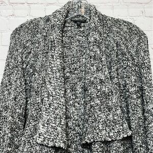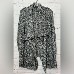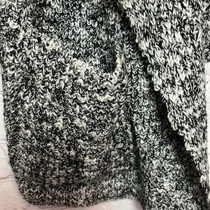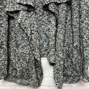 Black and white heathered waterfall style open front cardigan. Mini patch pockets on front. Long Sleeve. Mid Length.
