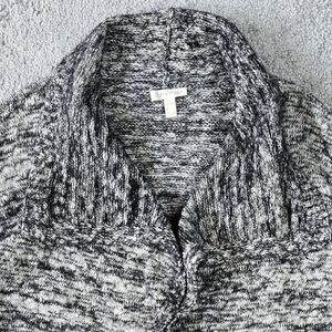 Good used condition, with no stains or tears. A soft and warm black and white cardigan, with a marled knit. Has an open front and 3/4 sleeves. The main tag is loose.