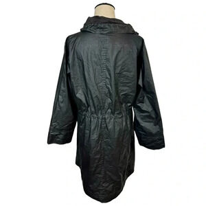 Lovely lightweight organic cotton long jacket. Stand collar with drawstring detail. Zip front with gathered in sit at the back. Side slant pockets.