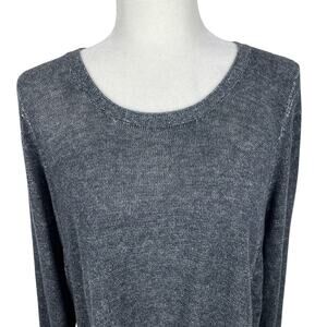 Organic cotton and tencel pullover tunic style sweater. Scoop neck, long sleeves, hi-lo hemline. Flowy hemline. Back center seam detail. 55% organic cotton, 45% tencel. Dark gray with a white undertone. Size medium. Please see photos for measurements.