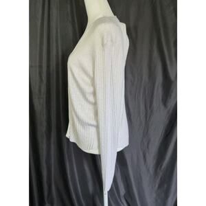 The Eileen Fisher Organic Cotton White Knitted Button-Up Sweater in size Large is a versatile and stylish addition to any woman's wardrobe. Made from tight-knit organic cotton, this sweater features a V-neckline and long sleeves, perfect for the winter, fall, and spring seasons. The cardigan style and solid white color make it easy to pair with various outfits, while the regular fit ensures comfort and a flattering silhouette. Machine washable for easy care, this sweater is a timeless and sustainable choice for your fashion needs.