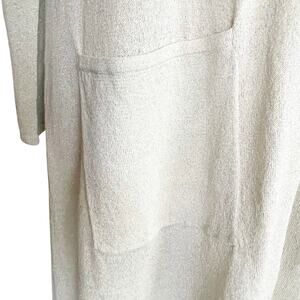 Eileen Fisher Organic Linen Blend Longline Open Front Cardigan Cream Metallic Size LARGE. Front patch pockets. Cream to off-white color with metallic sheen throughout. 54% organic linen, 27% polyester, 10% metallic, 9% nylon