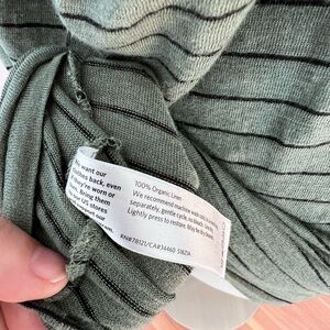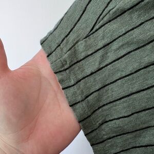 Stylish green striped tee dress by Eileen Fisher. Features short sleeves and a V-neck. Perfect for everyday comfort like running errands. In the nori colorway. 100% organic linen slub jersey. Works with the Eileen capsule wardrobe, find other pieces in the same color: Nori Green.