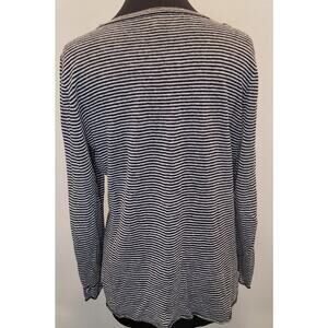 Chic Eileen Fisher petite blouse in black and white stripes, crafted from soft 100% organic linen. Features a front pocket and classic long sleeves for effortless layering or casual wear. Excellent pre-owned condition, with a small hole on the sleeve shown in photos.