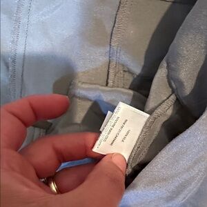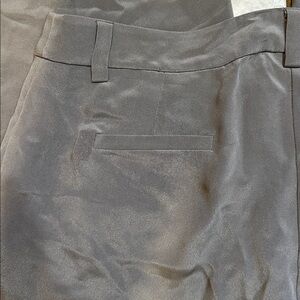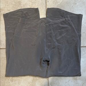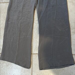 Gently worn Eileen Fisher Petite Gray Silk Pleated Slouchy Wide Trousers Pants women's size medium. 100% silk, lightweight flowy material, shiny gray, hidden button at waist, pleated in front, hip pockets, mid-rise waist, unlined, full length, rear slash pockets, drapey slouchy fit. On Trend for Fall! Offers accepted!