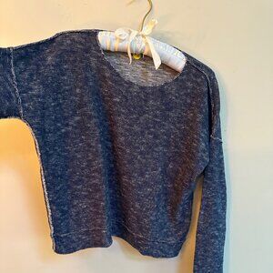 Details: Long sleeves, crew neckline, raw-edge exposed seams, banded bottom hem, cropped boxy fit