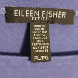 Women's purple/blue tunic top or dress by Eileen Fisher, size petite large. Item can be worn as a mini dress, depending on height, or over some leggings as a tunic top. Dress is a viscose and spandex fabric blend. Square neckline. Excellent pre-owned condition; no flaws.