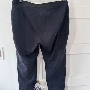 Eileen Fisher Black Leather Panel Ponte Leggings. Leggings with lamb leather in the front and ponte in the back. A pull-on style that's perfect under long tanks and tunics. Fitted through the hips, thigh and leg; ankle length. smooth elastic waistband; back darts for shape. Finished with seam detail just above the knee. Front Panel: 100% Lamb Leather Back Panel: 69% viscose 25% Nylon, 6% Spandex Dry clean