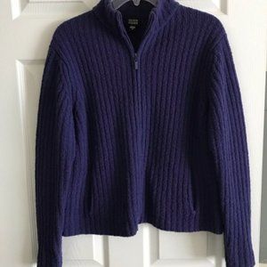 Eileen Fisher purple wool blend sweater. Quarter zip, 2 front pockets, some minor discoloration on the collar- dry clean only.