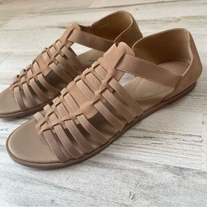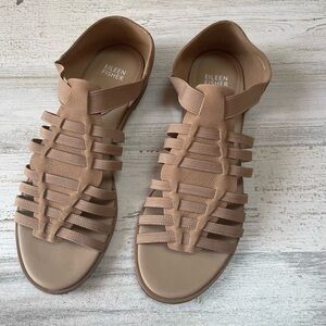 Eileen Fisher Rato Honey Tumbled Nubuck Leather Flats Gladiator Sandals, Elastic Straps!