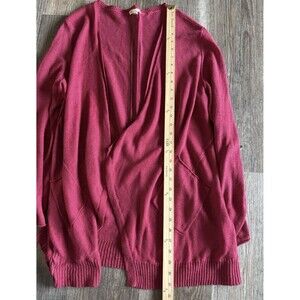 This Eileen Fisher cardigan sweater is a versatile addition to any wardrobe. Made from 100% linen, it features a solid red color with a crochet back and an open front pocket. The long sleeves and knit fabric make it perfect for travel, casual occasions, and various seasons including winter, summer, fall, and spring.