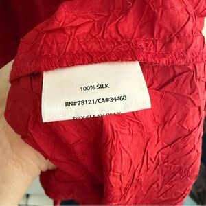 Size 3X. Great condition, no flaws. 100% silk. Crinkle pattern. Dark red color. Lightweight.