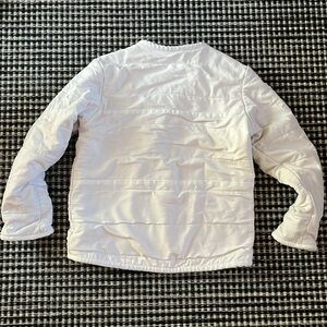 @savvyl33 there’s no tag since it was a renew project. Feels like mostly cotton, hard to say 100%. Outer is a white denim with some minor stretch, possibly Lycra/spandex but the way it’s quilted/constructed makes it seem extra durable, I only knew there was stretch when I tested the give on one of the rectangles. The liner seems like a high pile, almost loop wheel-like, cotton. I’ve added a closeup of the liner in the photos.