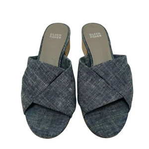 Eileen Fisher Ruche Mule Sandals Chambray Blue Denim Block Heel Comfort Women's Size 8