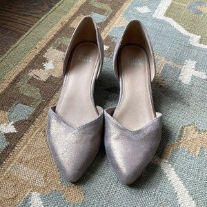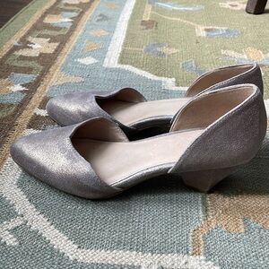 Eileen Fisher Rumi Metallic Suede Pumps. Champagne color leather. Size 7.5. V front with almond toe.