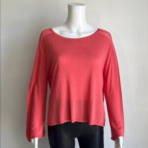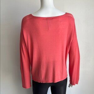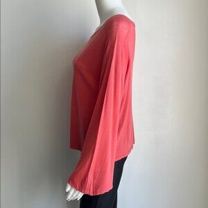 This salmon pink blouse by Eileen Fisher showcases a wide, rounded neckline and long sleeves, providing a relaxed and boxy fit. Crafted from a soft, draping fabric, it offers both comfort and effortless style, perfect for any occasion.