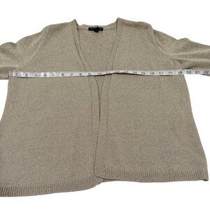 Eileen Fisher shimmer metallic sweater in good condition. Features an open front design and bracelet sleeves with ribbed cuffs. Constructed from Italian fabric with a blend of recycled cotton, polyester, and metallic threads, offering a stylish and sustainable fashion choice.