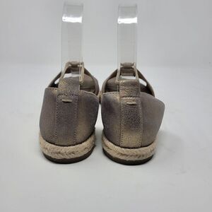 Glamorous Eileen Fisher Mews Espadrilles in a metallic bronze gold leather. These shoes feature a trendy peep toe design and comfortable slip-on style. Ideal for elevating your casual outfits with a touch of sparkle.