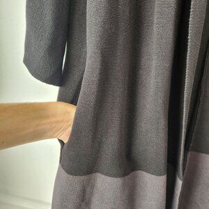 This Eileen Fisher long sleeve sleeve open front cardigan is absolutely beautiful and ready for Fall and Winter! It features an front, black grey colorblocking, and soft warm silk blend fabric.