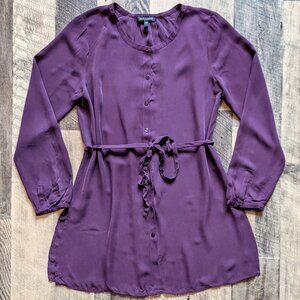 This is an Eileen Fisher Shirt Dress in purple. It is in good pre-owned condition, with a couple small stains on one sleeve and a few tiny stains on the front near the drawstring (see the second image for a close-up). It is a size small, and the last three images show measurements. Button-front closure, drawstring waist, long sleeves, button-cuffs, round neckline, mini length, lightweight 100% silk fabric.