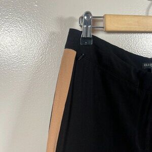 Eileen Fisher Silk Georgette Crepe Straight Pants. Color: Black with tan side stripes.Zip and hook-and-eye closure. Smooth silhouette. Hidden small zip pockets at the waistline. Relaxed, straight legs. 100% silk.