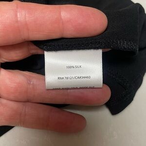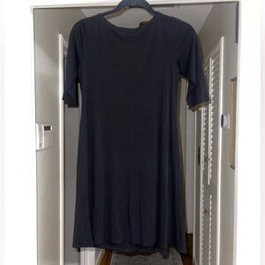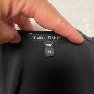 Eileen Fisher black silk sheath dress with sequin detailing around the neckline. This dress is made of silk and has a knee-length cut with three-quarter sleeves.
