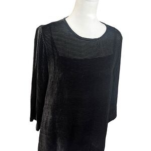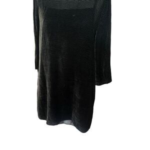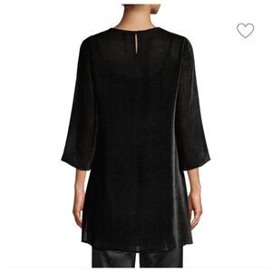 Luxurious and versatile Eileen Fisher silk velvet burnout tunic in timeless black. Features subtle burnout stripe texture, 3/4 sleeves, relaxed oversized fit, and lightweight slip lining for comfort and coverage. Chic minimalist style perfect as a tunic over leggings or styled alone as a mini dress. New with tags — effortless elegance for work, events, or evening wear.
