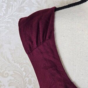Beautiful burgundy dress has ruching on the sides for a flattering silhouette. Scoop neck. Sleeveless. Seam below the bust. Hidden back zipper. Fully lined.