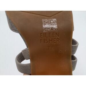 The product is a pair of Eileen Fisher Size 7.5 small sandals in silver/gold shimmer, designed for women. These elegant sandals feature a strappy style with a solid color pattern and leather lining material. The outsole is made of rubber, making them suitable for summer wear. The brand, Eileen Fisher, is known for its classy and versatile footwear, making these sandals a stylish addition to any woman's wardrobe.