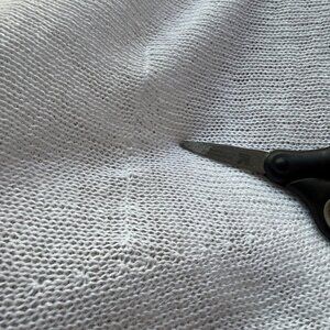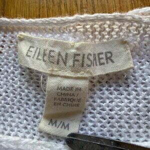 Eileen Fisher, white knit top, women's casual top, breathable cotton shirt, lightweight shirt, relaxed fit tee, short sleeve top, high-low hem top, women's M top, white summer shirt, casual knitwear, designer knit top, comfortable women's shirt, sheer top, open knit top, layering top, beach top, vacation, resortwear, summer