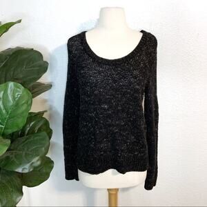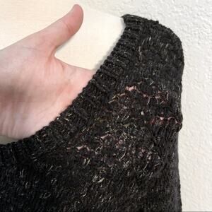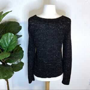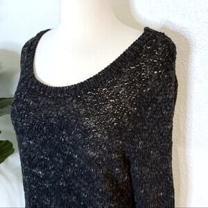 Eileen Fisher — Soft Tinted Tape Twist crew neck long sleeved open knit sweater in speckled marled charcoal (dark gray/black).
