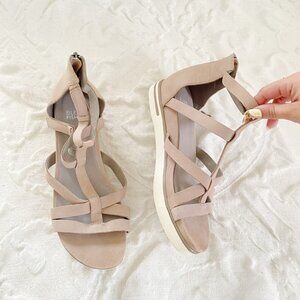 With a molded footbed and crisscross gladiator straps, in tumbled nubuck leather.