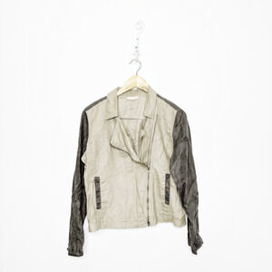 A classic moto jacket gets lightweight ease from natural organic linen with neutral two-tone coloring and a cute, cropped silhouette styled in a moto-inspired color block style. Asymmetrical 2-way zipper closure, classic collar, front and back princess seams, on seam side pockets, cuffed sleeves with a snap closure - easy to roll up, unlined.