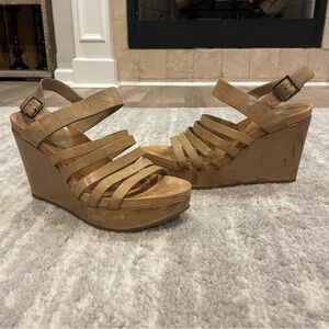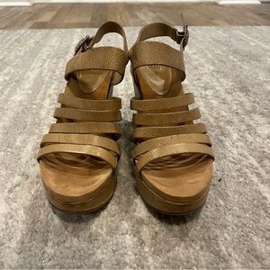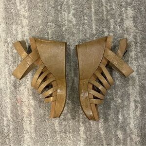 Intentionally distressed leather, these Eileen Fisher Strappy Wedge Platforms are in excellent condition. Only worn once, they have one flaw shown on the inside of the right shoe but the natural patina covers it up.