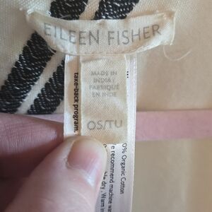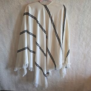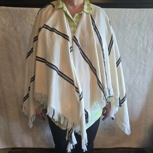 Stylish cream poncho with black stripes. Features fringe detailing.
