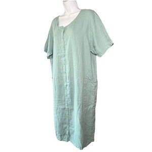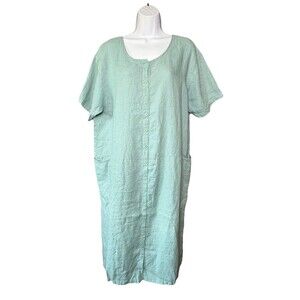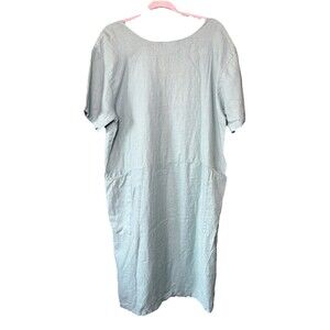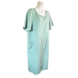 This Eileen Fisher System Linen Shift Dress in mint green is a stylish and comfortable option for women in size S/M. This long, lightweight dress features a scoop neckline, short sleeves, and button closure, making it perfect for a casual or travel outfit. The solid color and linen material add a touch of elegance, while the pockets provide functionality. Designed by Eileen Fisher in the United States, this dress is machine washable and suitable for the seasons of summer, fall, and spring.