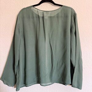 This lightweight, sheer silk blouse offers a relaxed fit with a sophisticated look. Its long sleeves and soft green tone make it versatile for work or casual settings. Crafted by Eileen Fisher, it combines elegant style with comfort for a polished wardrobe staple.