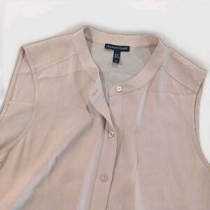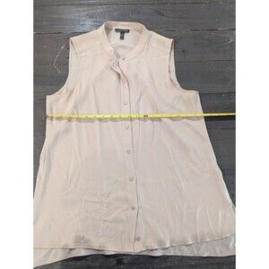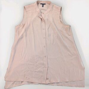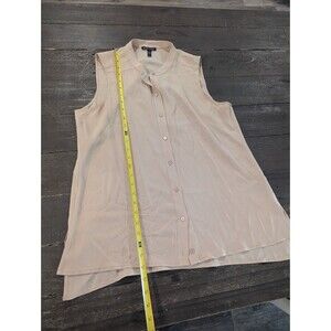 The Eileen Fisher Tan Collar High/Low Silk Shirt in Beige, size Small Petite, is a stylish and versatile addition to any woman's wardrobe. Made from 100% silk, this sleeveless button-up shirt features a solid pattern and a collared neckline for a classic look. Perfect for casual occasions, this top in ivory showcases the brand's signature buttercream style, born in China and tailored for regular sizing. Ideal for petite women looking for a sophisticated yet comfortable piece to add to their collection.